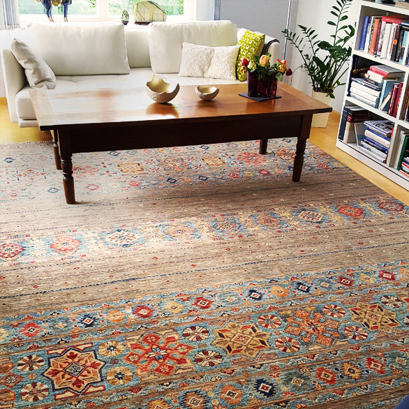 Dieser moderne Kaschkuli hat seinen Ursprung in der Knüpfkunst der Nomadenstämme Zentralirans. Durch sein geometrisches Muster und die leichten Farben verleiht er dem Raum eine klare Struktur und schafft eine Insel der Behaglichkeit.