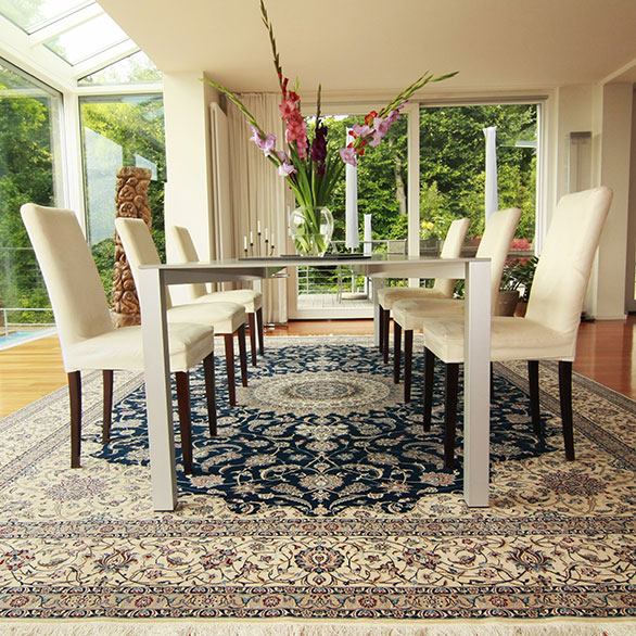 Nain-Teppiche sind nicht nur durch ihre hohe Knüpfdichte bekannt, sondern insbesondere durch die farbliche Reduzierung auf wenige Töne. Blau und Beige sind bei diesem Teppich die dominierenden Farben. Hierdurch erhält dieser eine klassisch-moderne Ausstrahlung, wodurch er sich perfekt unterschiedlichsten Einrichtungsstilen anpasst.
