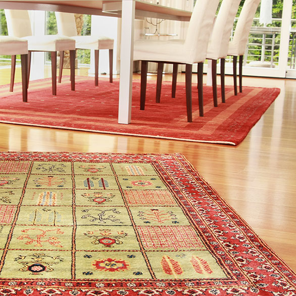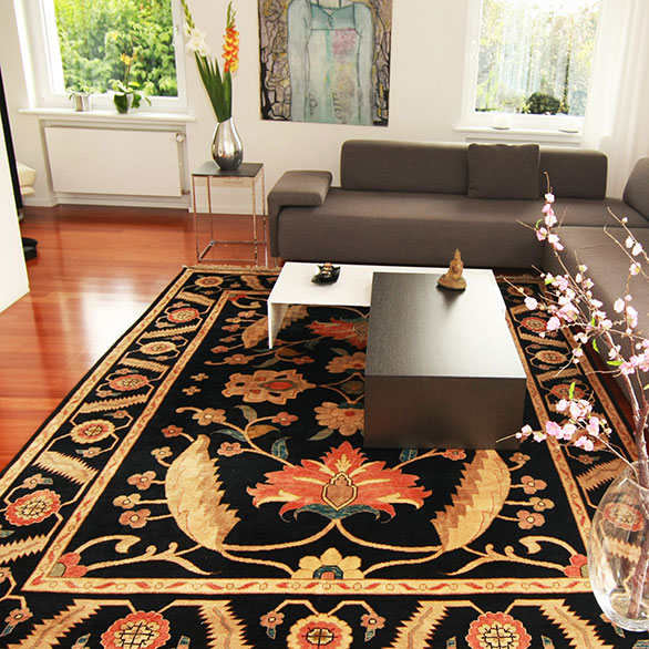 Ein echter Bidjar-Teppich trägt die jahrtausendealte Entwicklung der orientalischen Knüpfkunst in sich. Die floralen Muster, ein Sinnbild für die Natur, bilden einen spannungsvollen Kontrast zur eher modernen, nüchternen Architektur der Räume.