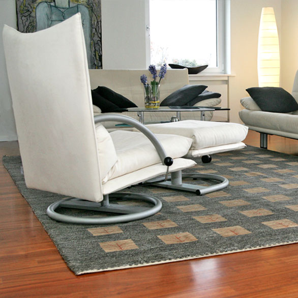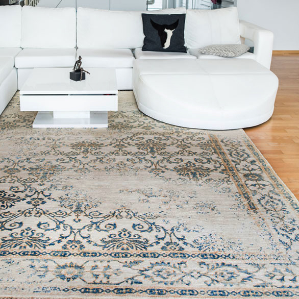 Ein zurückhaltendes Farbenspiel und großzügige Muster entfalten subtil ihre Wirkung im Raum. Eher unauffällig und dezent fügt sich dieser Teppich in das Wohnambiente ein.